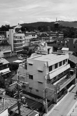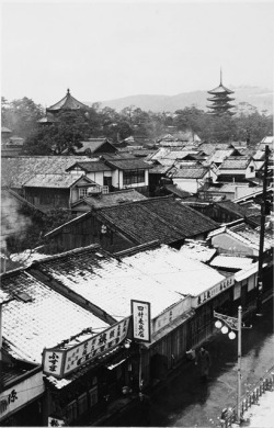 左から県庁塔屋、南円堂、五重塔、それに若草山が遠くにみえる。いま は瓦屋根の日本家屋は、ごくわずかになった。