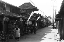 当時は清水通りとよび、下清水町といった。向かって左の寺院は地蔵盆 で賑わう。この商店街は東部、南部の旧村からの買い物客で繁盛してい た。(撮影=入江泰吉、提供=奈良市写真美術館)
